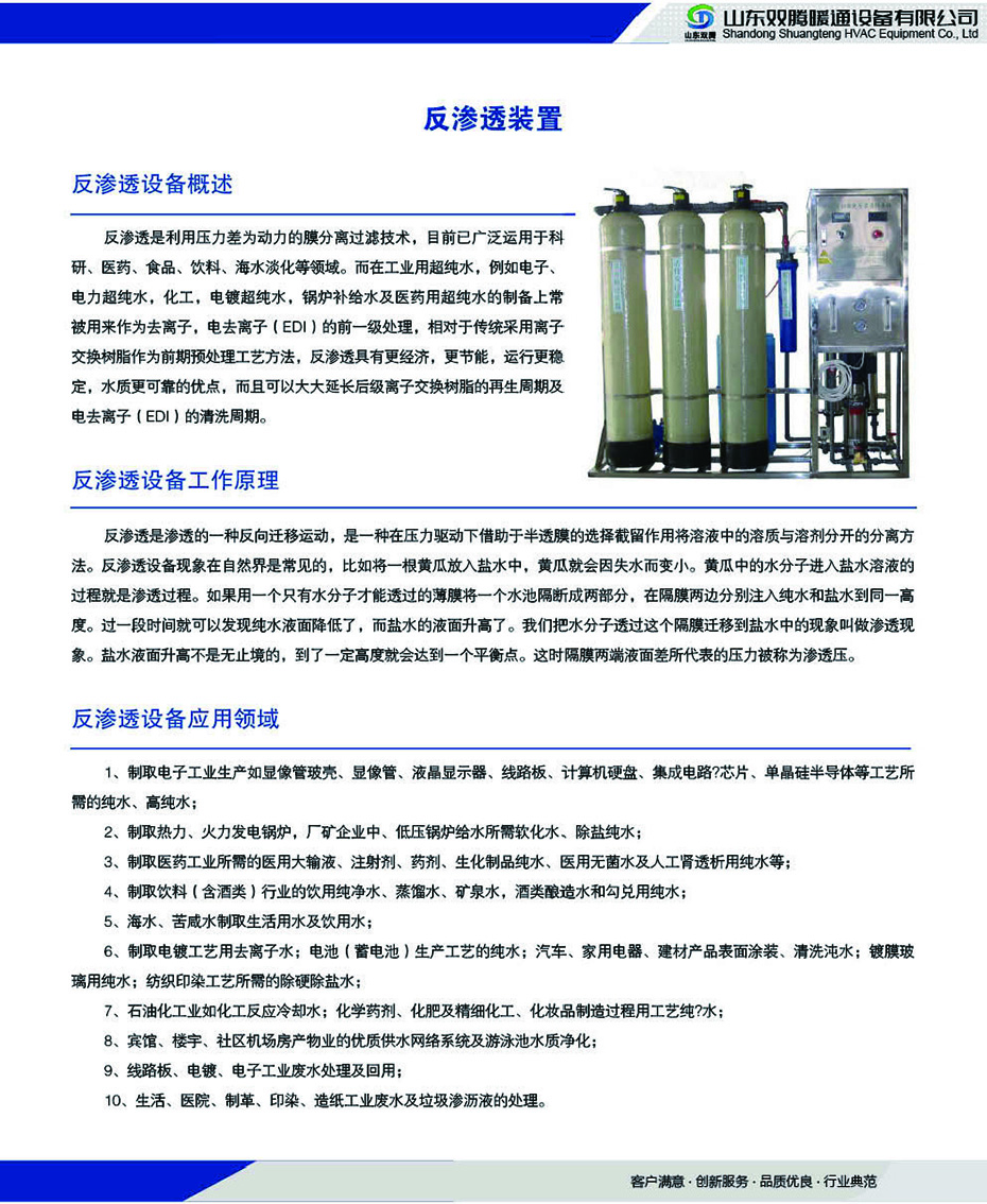 反滲透是利用壓力差為動(dòng)力的膜分離過(guò)濾技術(shù)目前已廣泛運(yùn)用于科研、醫(yī)藥、食品、飲料、海水淡化等領(lǐng)域。而在工業(yè)用超純水例如電子、電力超純水化工電鍍超純水鍋爐補(bǔ)給水及醫(yī)藥用超純水的制備上常被用來(lái)作為去離子電去離子(ED)的前一級(jí)處理相對(duì)于傳統(tǒng)采用離子交換樹脂作為前期預(yù)處理工藝方法反滲透具有更經(jīng)濟(jì)更節(jié)能運(yùn)行更穩(wěn)定水質(zhì)更可靠的優(yōu)點(diǎn)而且可以大大延長(zhǎng)后級(jí)離子交換樹脂的再生周期及電去離子(ED)的清洗周期。