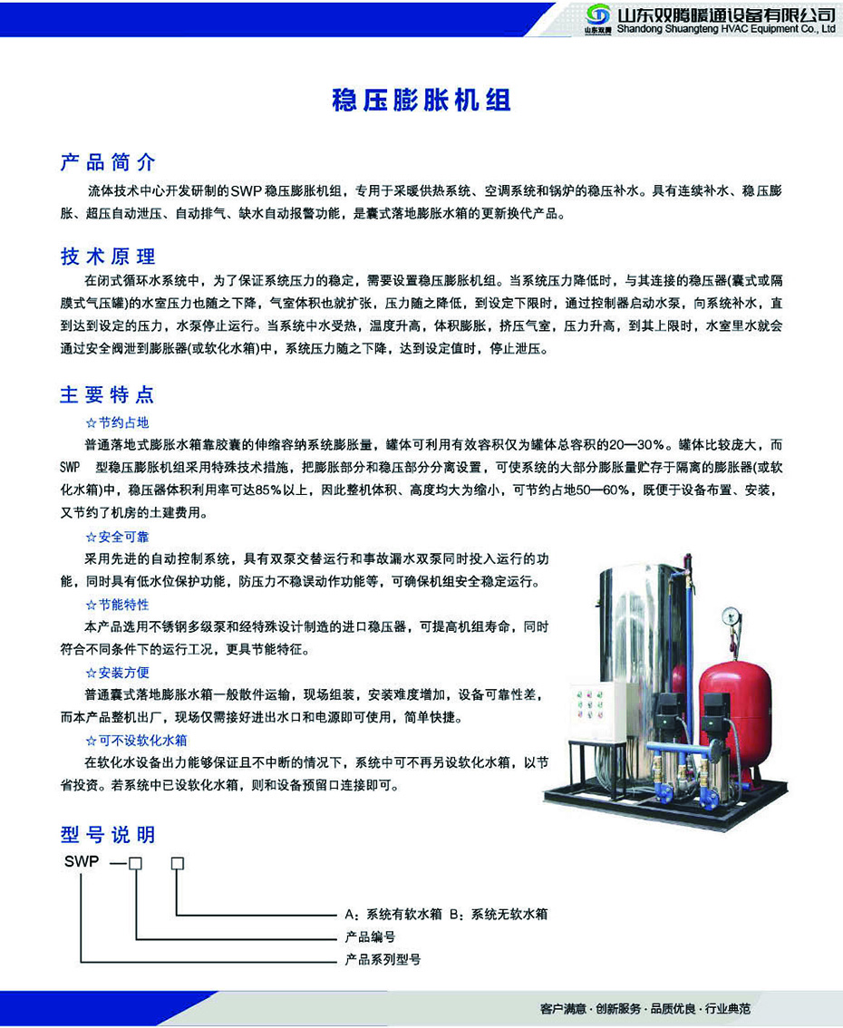 穩(wěn)壓膨脹機(jī)組 1、一次充氣可保持長(zhǎng)久使用,維護(hù)費(fèi)用低;2、罐體內(nèi)裝有無(wú)毒橡膠囊、水氣不接觸,保證了水質(zhì)不受外界污染。3、占地面積小、受環(huán)境影響低安裝、調(diào)試、操作、維修、簡(jiǎn)單方便。4、可取代生活、消防、采暖及空調(diào)用的高位水箱及水塔,有利于建筑美觀和結(jié)構(gòu)抗震,降低建筑造價(jià)。5、能自動(dòng)消除管網(wǎng)中的水錘和沖擊噪音。