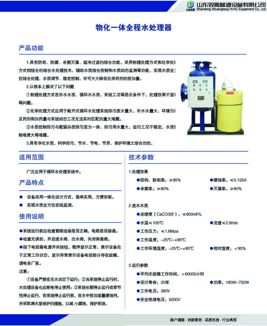 具有防垢、防腐、殺菌滅藻、超凈過濾的綜合功能采用物理處理方式和化學(xué)處方式相結(jié)合的綜合水處理技術(shù)輔助水質(zhì)綜合控制和水質(zhì)動(dòng)態(tài)監(jiān)測(cè)等功能實(shí)現(xiàn)水質(zhì)全位綜合處理水質(zhì)調(diào)節(jié)、穩(wěn)定控制并可大大降低化學(xué)藥劑的投加量2從根本上解決了以下問題①物理處理方式在補(bǔ)水水質(zhì)、循環(huán)水水質(zhì)、系統(tǒng)工況等惡劣條件下處理效果不顯等問題。