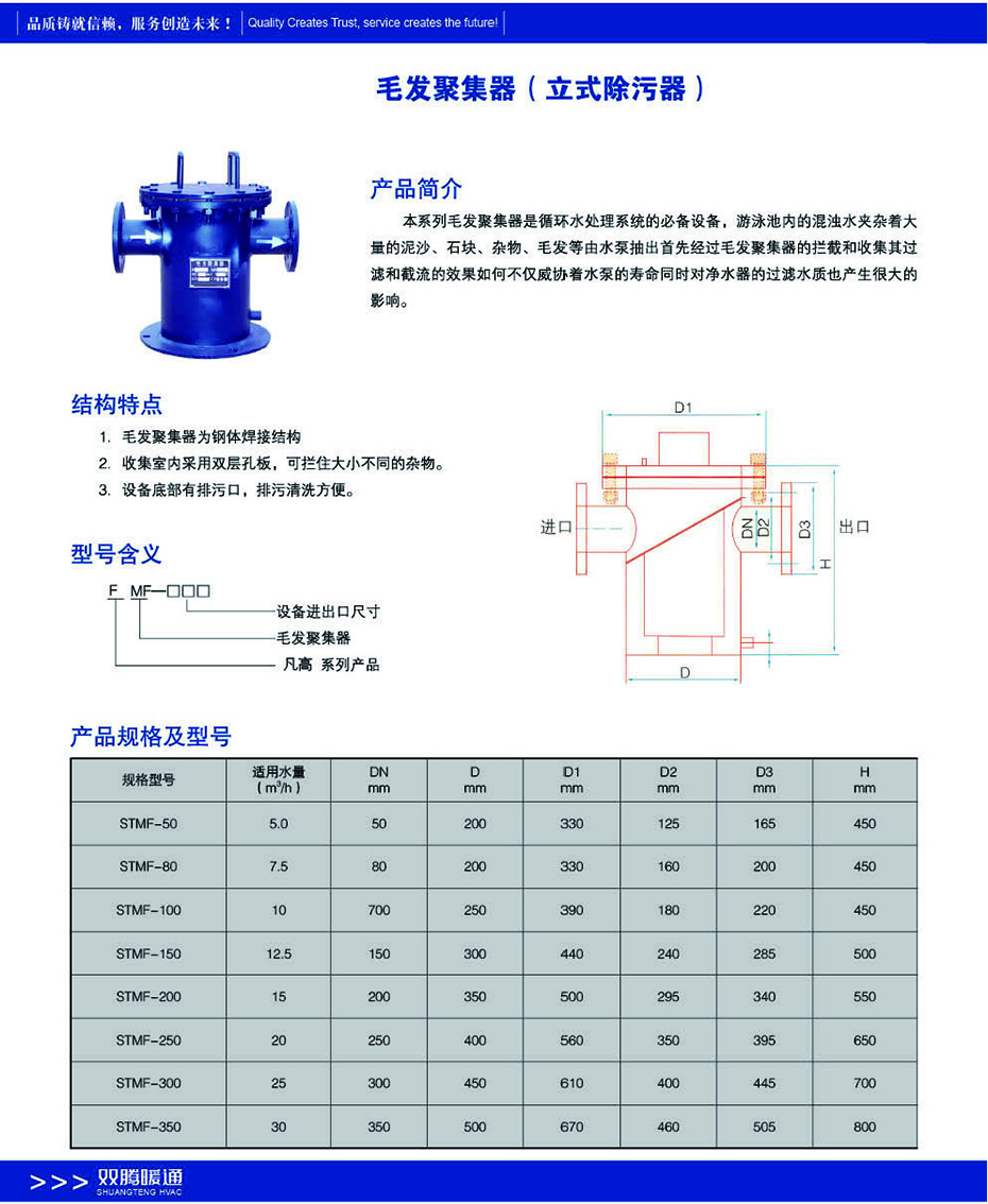 本系列毛發(fā)聚集器是循環(huán)水處理系統(tǒng)的必備設(shè)備游泳池內(nèi)的混濁水夾雜著大量的泥沙、石塊、雜物、毛發(fā)等由水泵抽出首先經(jīng)過(guò)毛發(fā)聚集器的攔截和收集其過(guò)濾和截流的效果如何不僅威協(xié)著水泵的壽命同時(shí)對(duì)凈水器的過(guò)濾水質(zhì)也產(chǎn)生很大的影響。